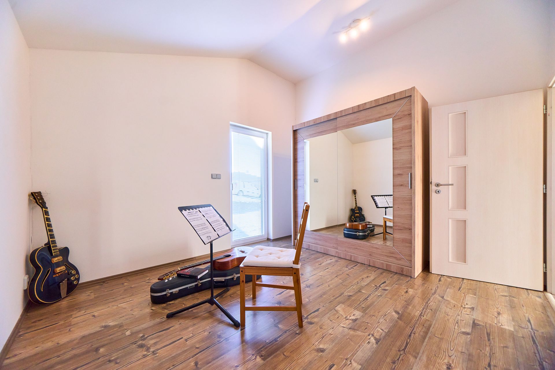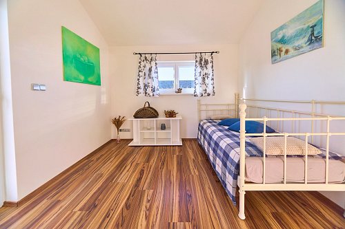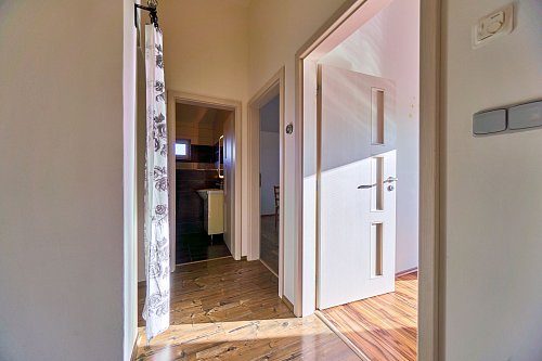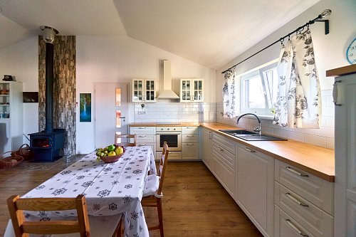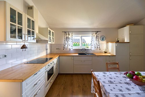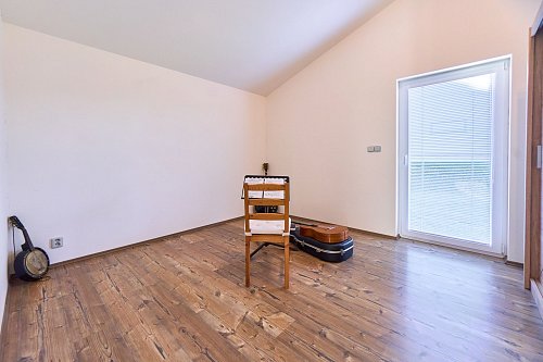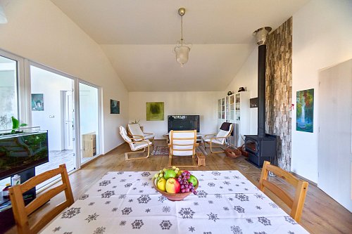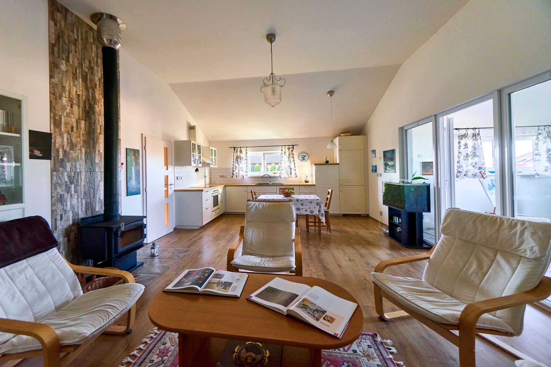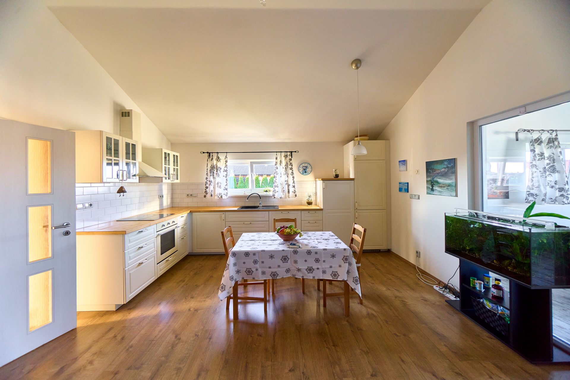 Uvnitř najdete prostorný obývací pokoj volně navazující na kuchyni, ložnici, dětský pokoj