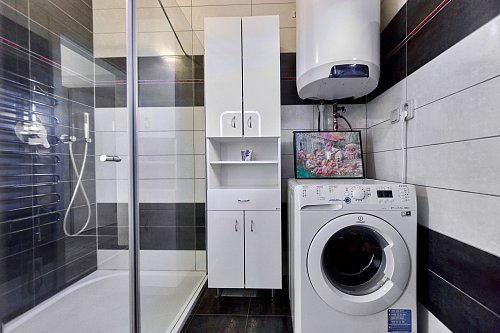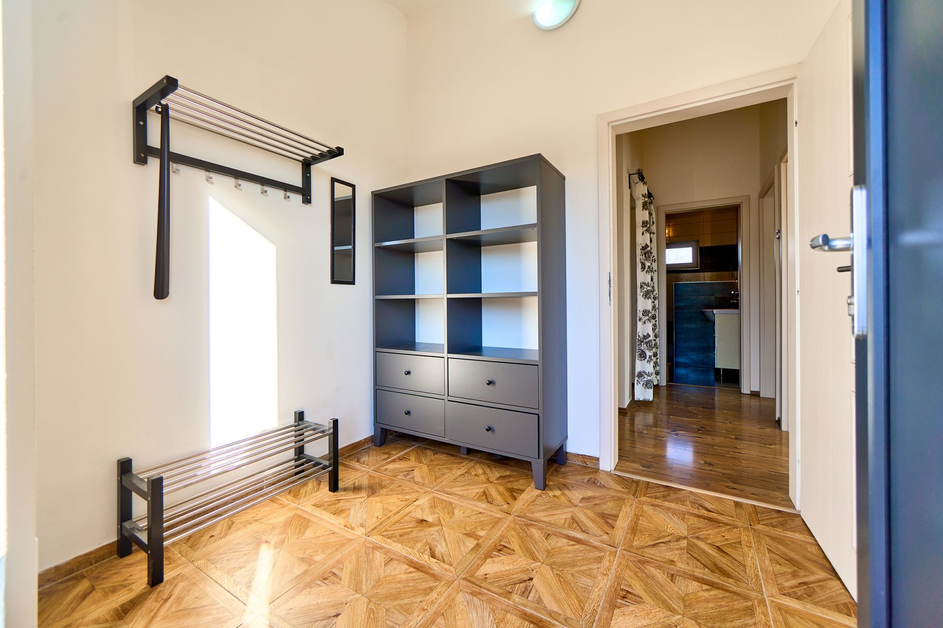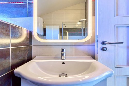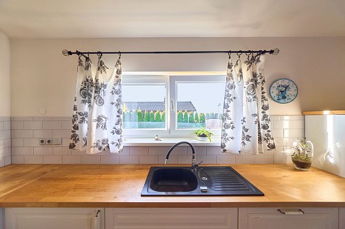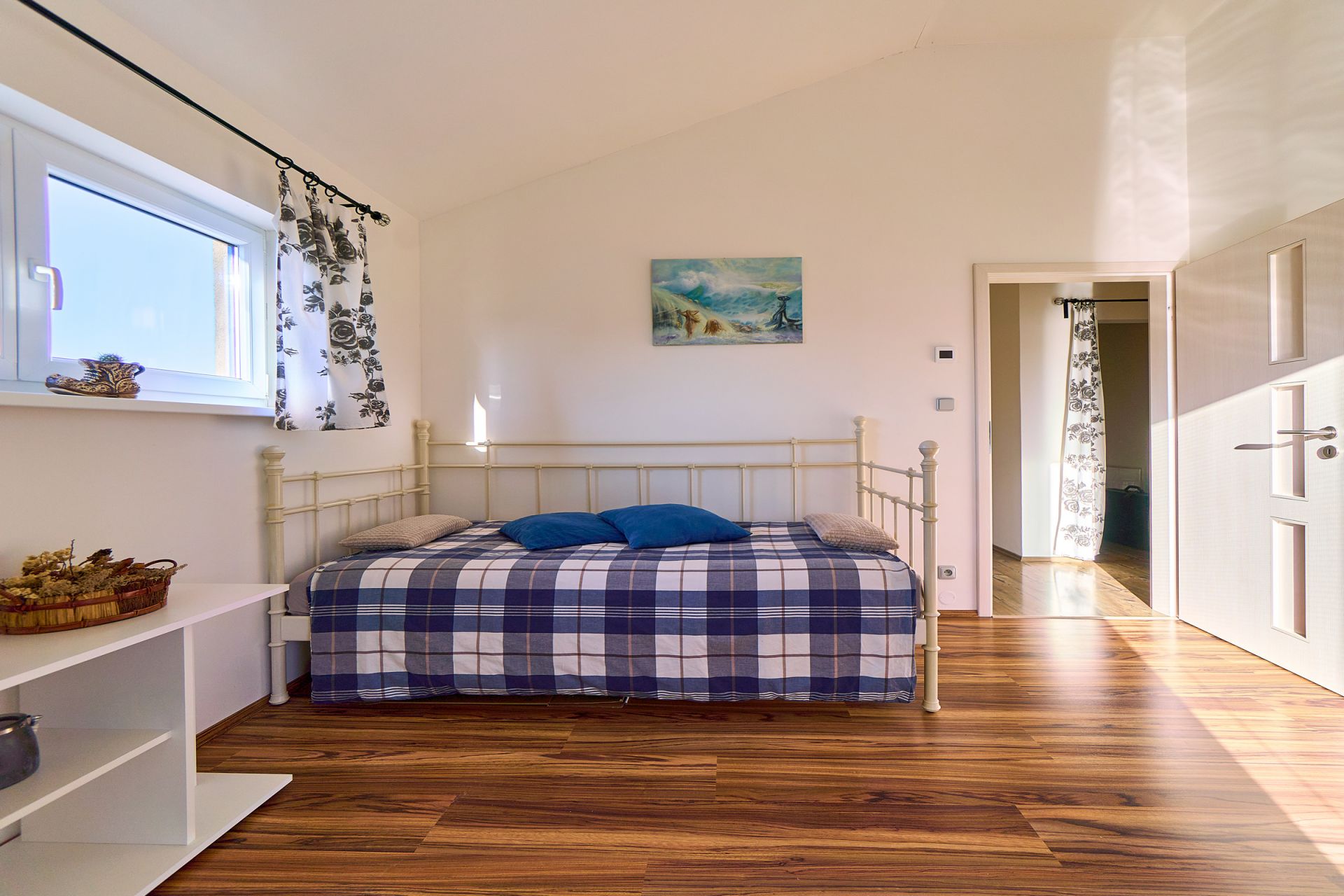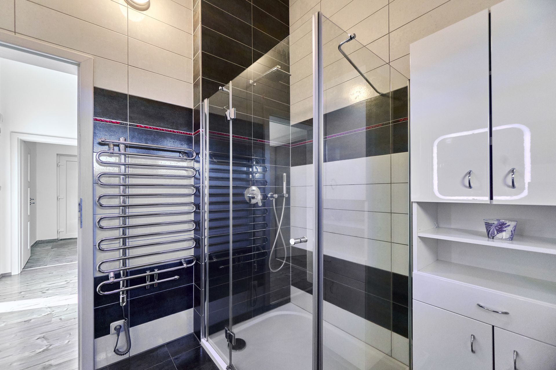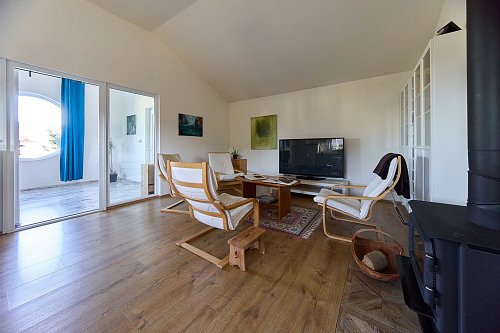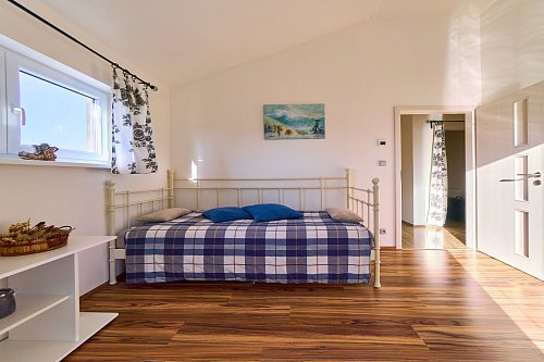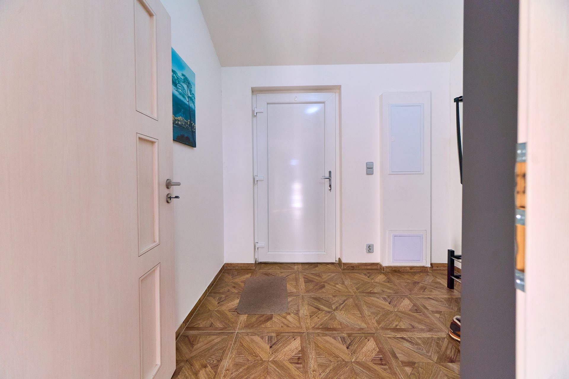 Uvnitř najdete prostorný obývací pokoj volně navazující na kuchyni, ložnici, dětský pokoj